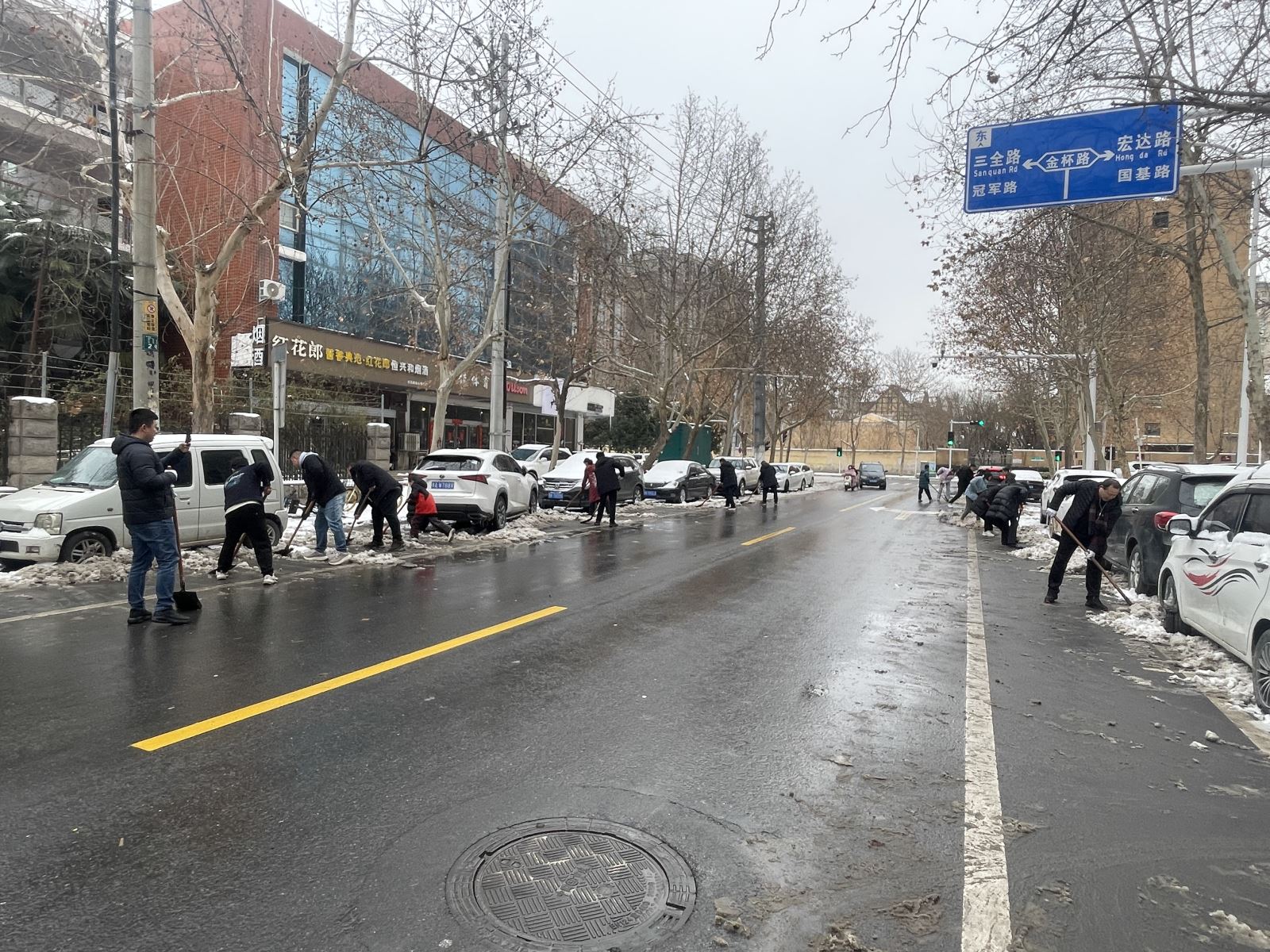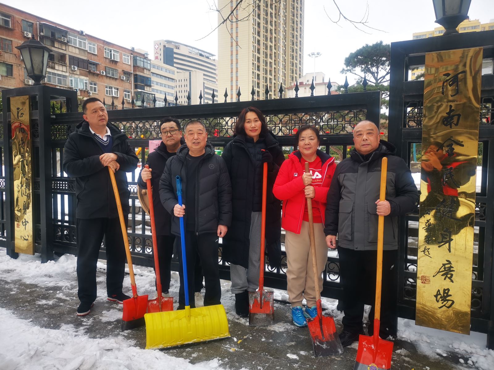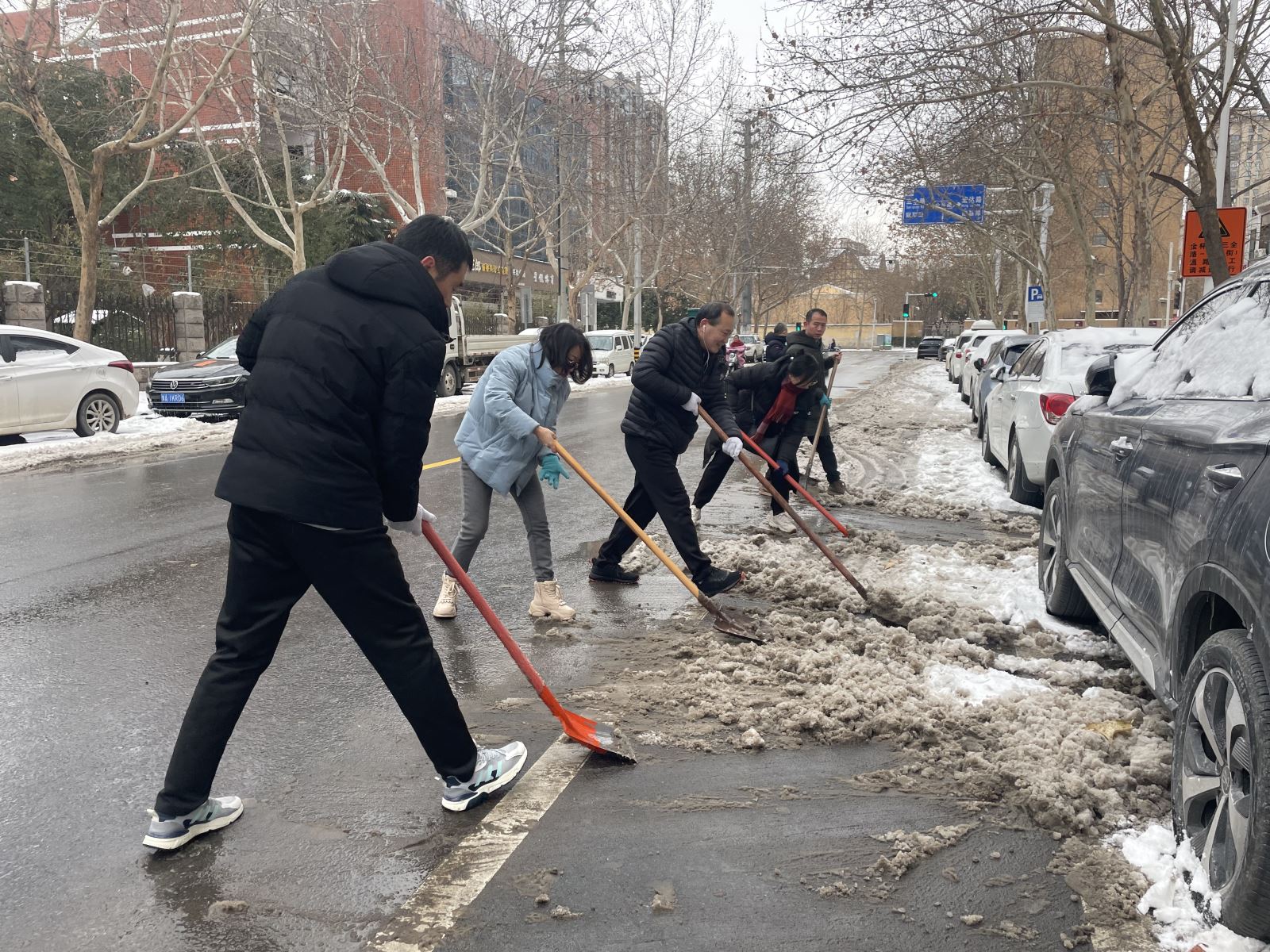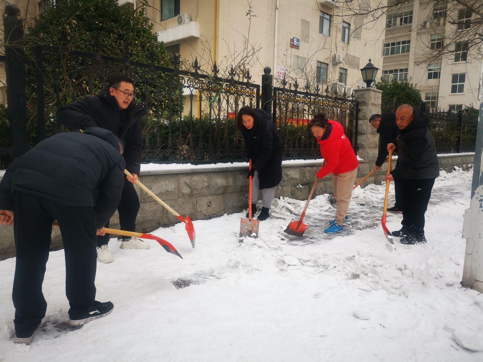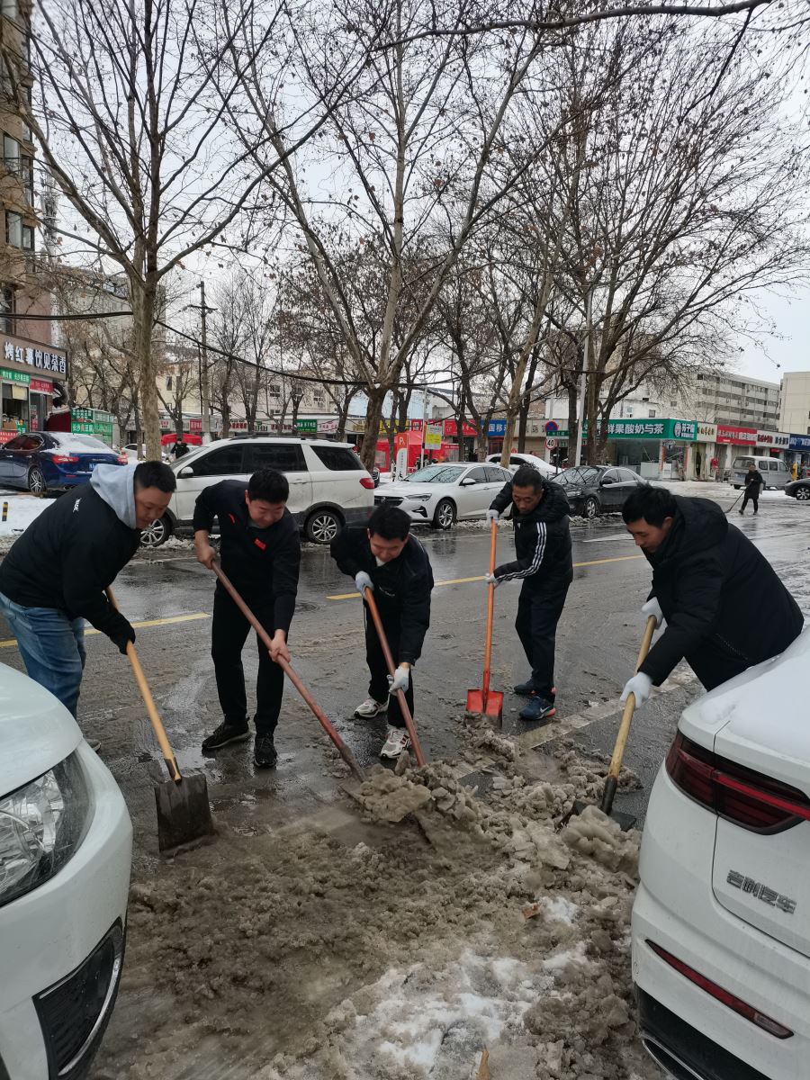 虽兵分两处,但志愿者们心往一处想、劲往一处使。活动现场,大家不畏严寒,干劲十足,或两人协力,或三五组队,或一字排开协同推进,使劲挥动着自己手中的工具。从社区门口主干道,社区小路,到活动广场,都留下了一个个斗志昂扬、甘为奉献的身影,即使双脸冻得通红,双手冻得僵硬,仍团结协作为社区群众清理出一条条暖心之路,在皑皑白雪中构成了一道道亮丽的风景线。