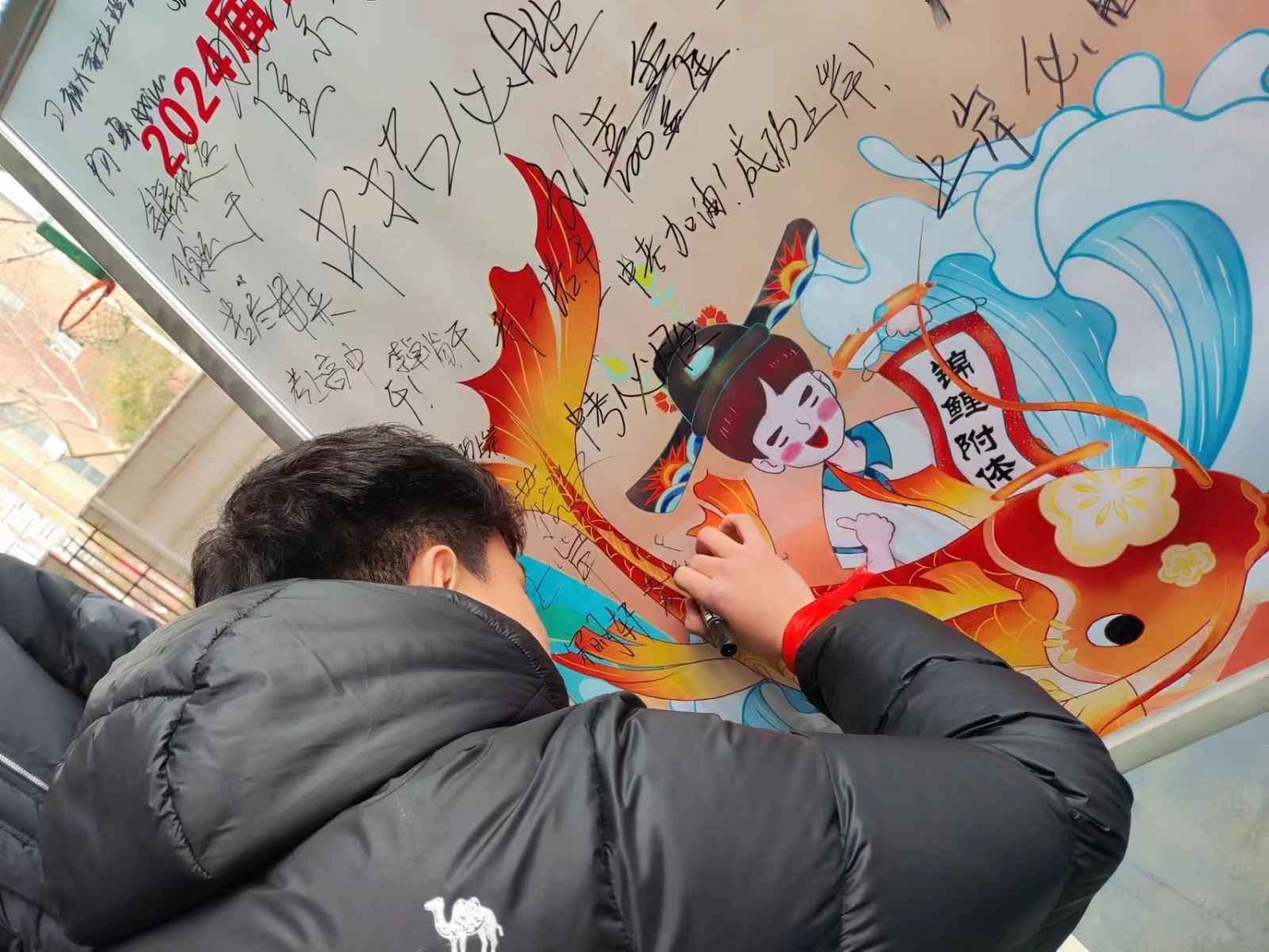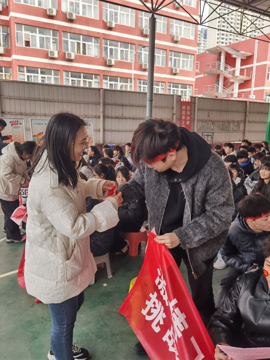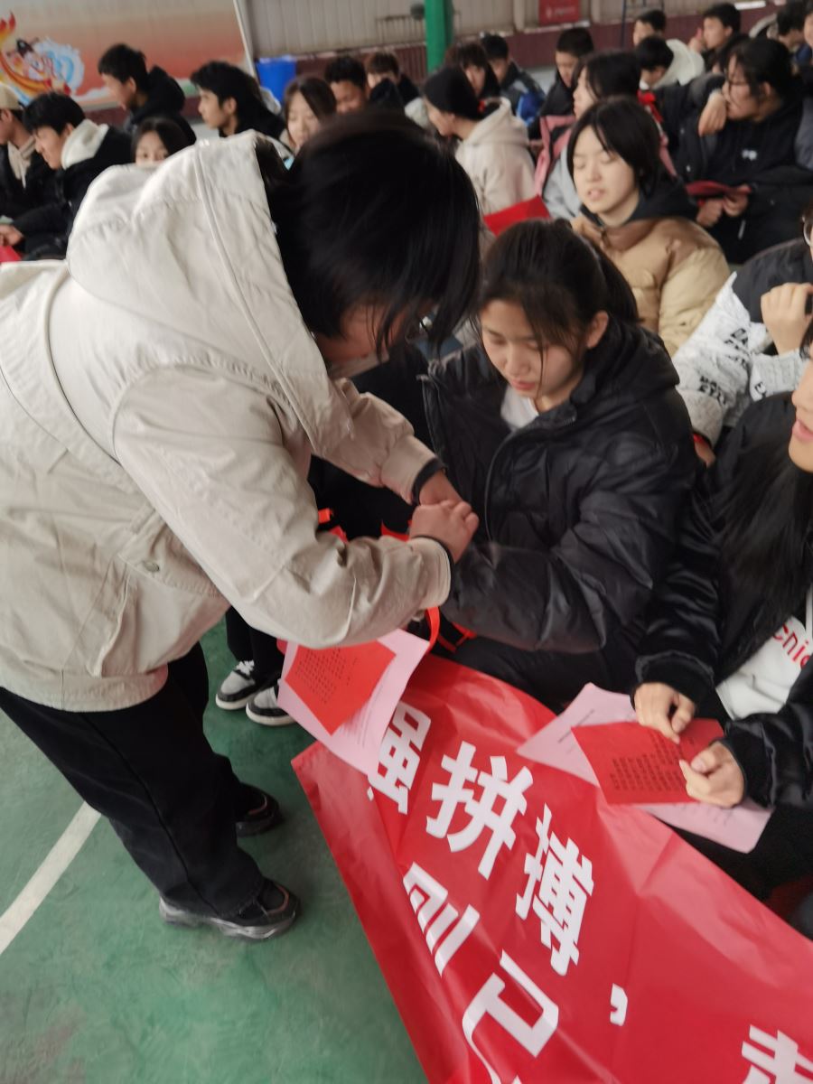 红丝带镌刻蟾宫折桂的决心和信念,班主任老师为学生代表系上红丝带,传递长风破浪的殷切期望