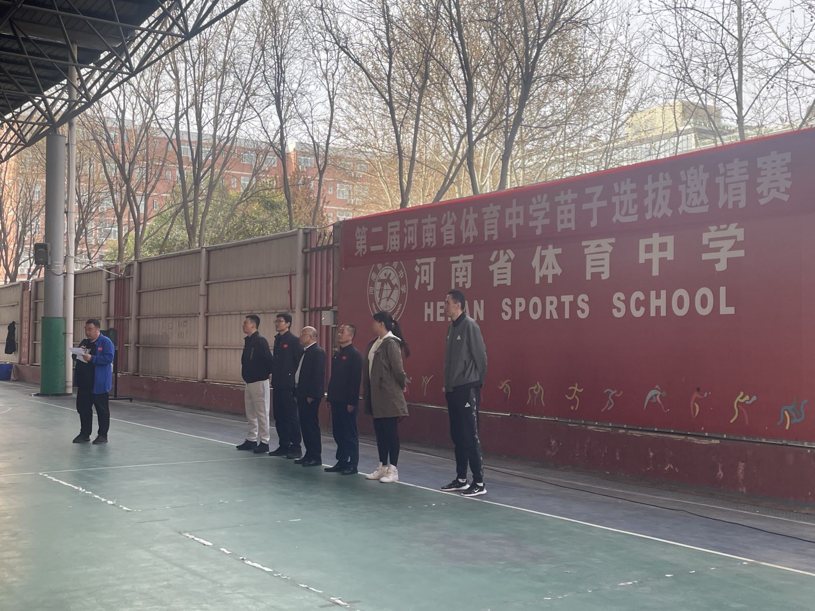 3月30日上午,第二届河南省体育中学篮球苗子选拔邀请赛在省体育中学篮球场正式拉开帷幕。省体育中学校长宋振启、副校长赵华圣、竞训科科长冯毅、一中心主任李岩、国家级裁判员张晓萌等领导和裁判出席了开幕式。仪式由竞训科科长冯毅主持。