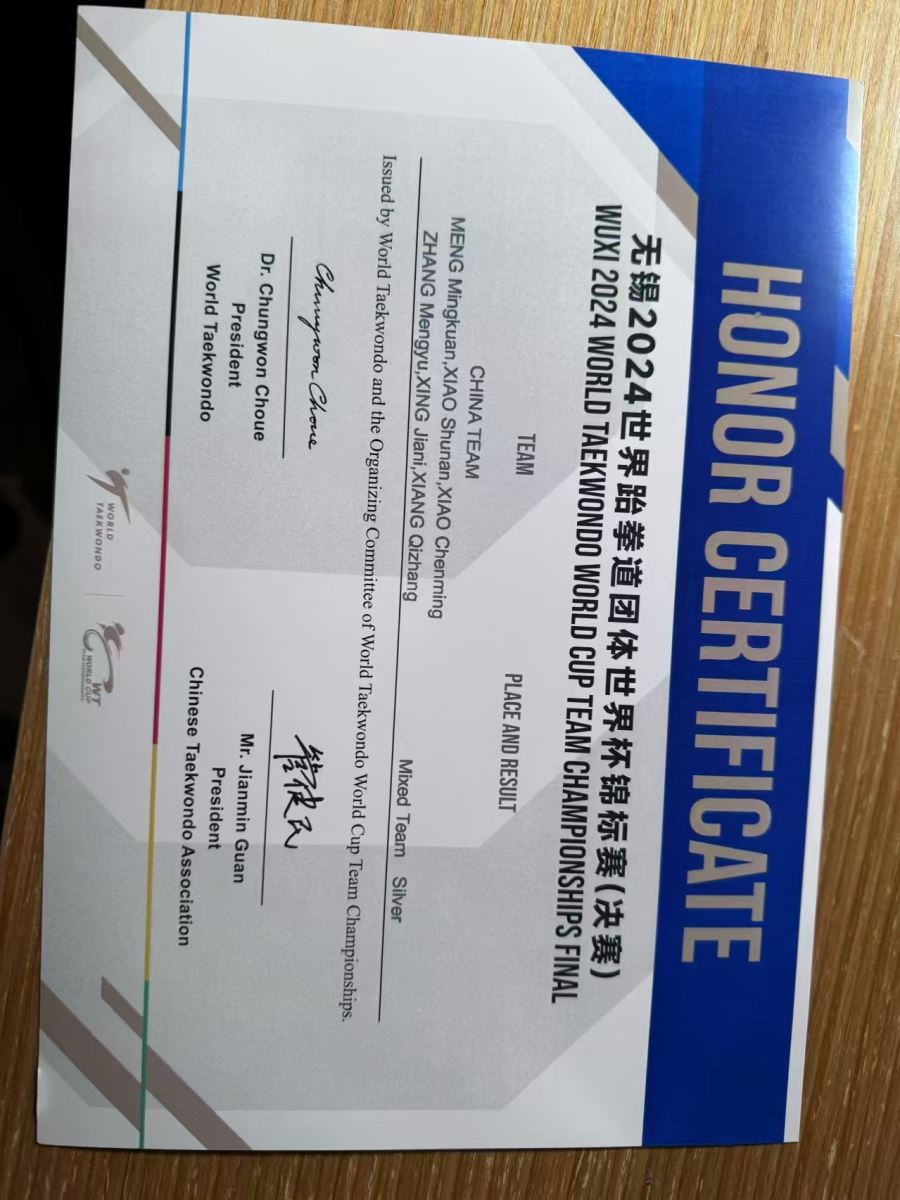 2024年跆拳道团体世界杯锦标赛于2024年12月10日在江苏无锡收官,我校2017届毕业生肖晨鸣随中国跆拳道国家队参赛,获得混合团体项目银牌。赛场上肖晨鸣同学敢打敢拼,展现出新时代跆拳道健儿的风采,为学校、国家争得了荣誉。让我们向获奖运动队、运动员表示祝贺!